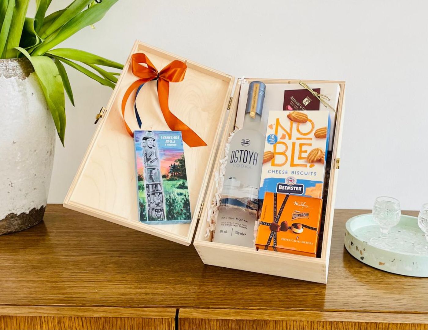 Box upominkowy Szafir to sprawdzony prezent na święta z alkoholem. Obdarowany znajdzie w tym boxie wódkę oraz słodkie i wytrawne przekąski-zakąski. To doskonały prezent dla pracowników na święta oraz box z wódką dla mężczyzny.