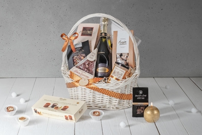 - kosz prezentowy Ballada zestaw upominkowy w białym koszu. Kosz ten skrywa wino musujące, kawę 100% Arabica, miód z polskiej pasieki, pierniki, czekolady, bombonierki, bakalie… czegoż chcieć więcej?!