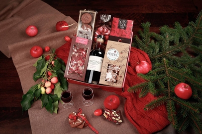 - kosz upominkowy Oda – nasz klasyk z czerwonym winem, w otoczeniu słodyczy. To połączenie, które zawsze się sprawdza!