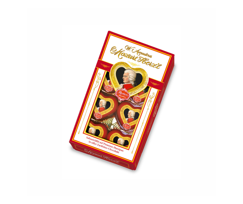 Serduszka czekoladowe z nadzieniem pistacjowo - marcepanowym Mozart 80 g, Reber [385]