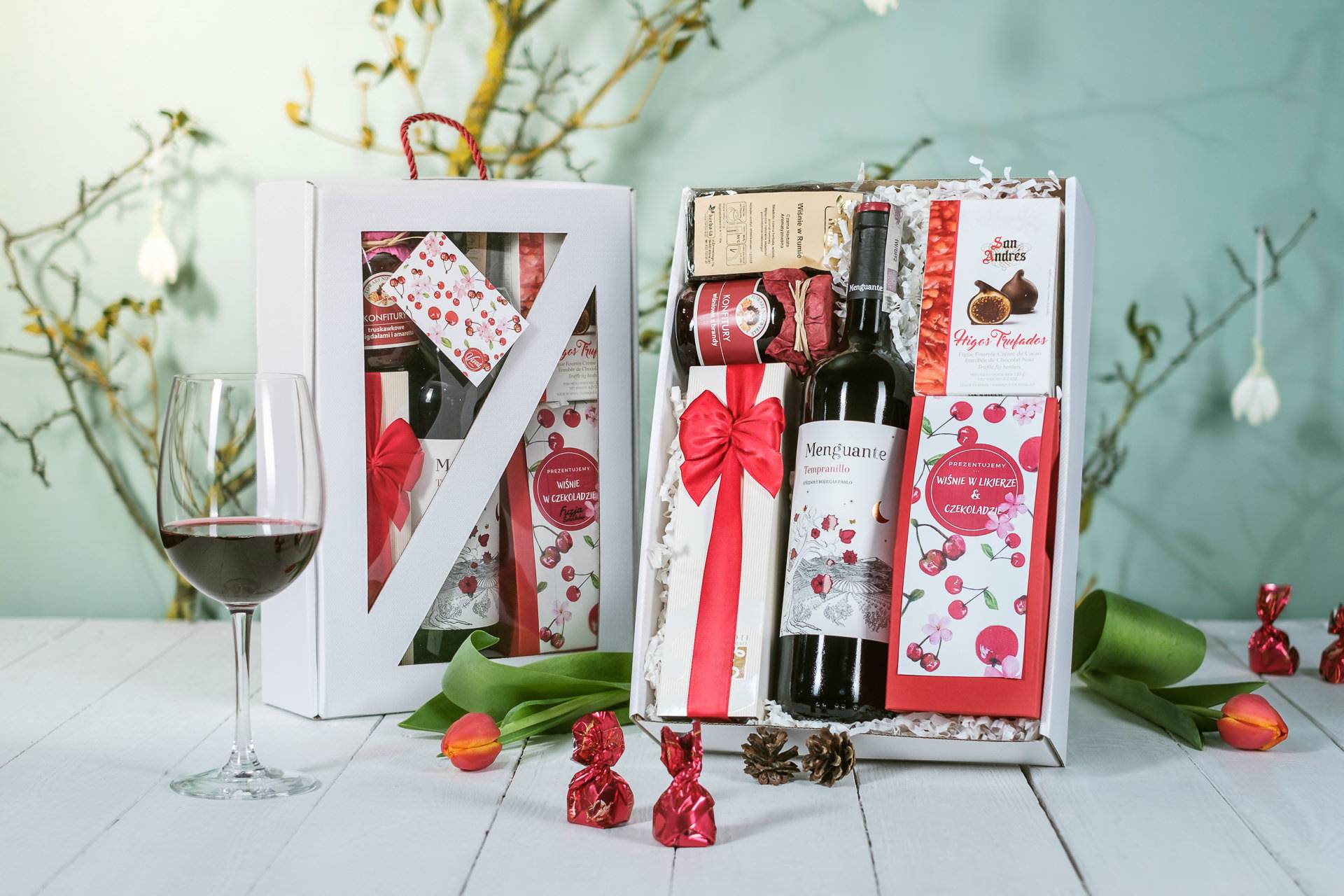 Jaki jest ten zestaw upominkowy na Wielkanoc? Ten box prezentowy dla niej skrywa w sobie czerwone wino oraz wiśniowe frykasy - wiśniowe konfitury z brandy, wiśniową herbatę z rumem oraz wiśnie w likierze. A wszystko to przy akompaniamencie hiszpańskich fig nadziewanych truflą oraz belgijskich pralin. Ten zestaw prezentowy z winem doskonale sprawdzi się jako box prezentowy dla kobiety, a także jako prezent firmowy z alkoholem.