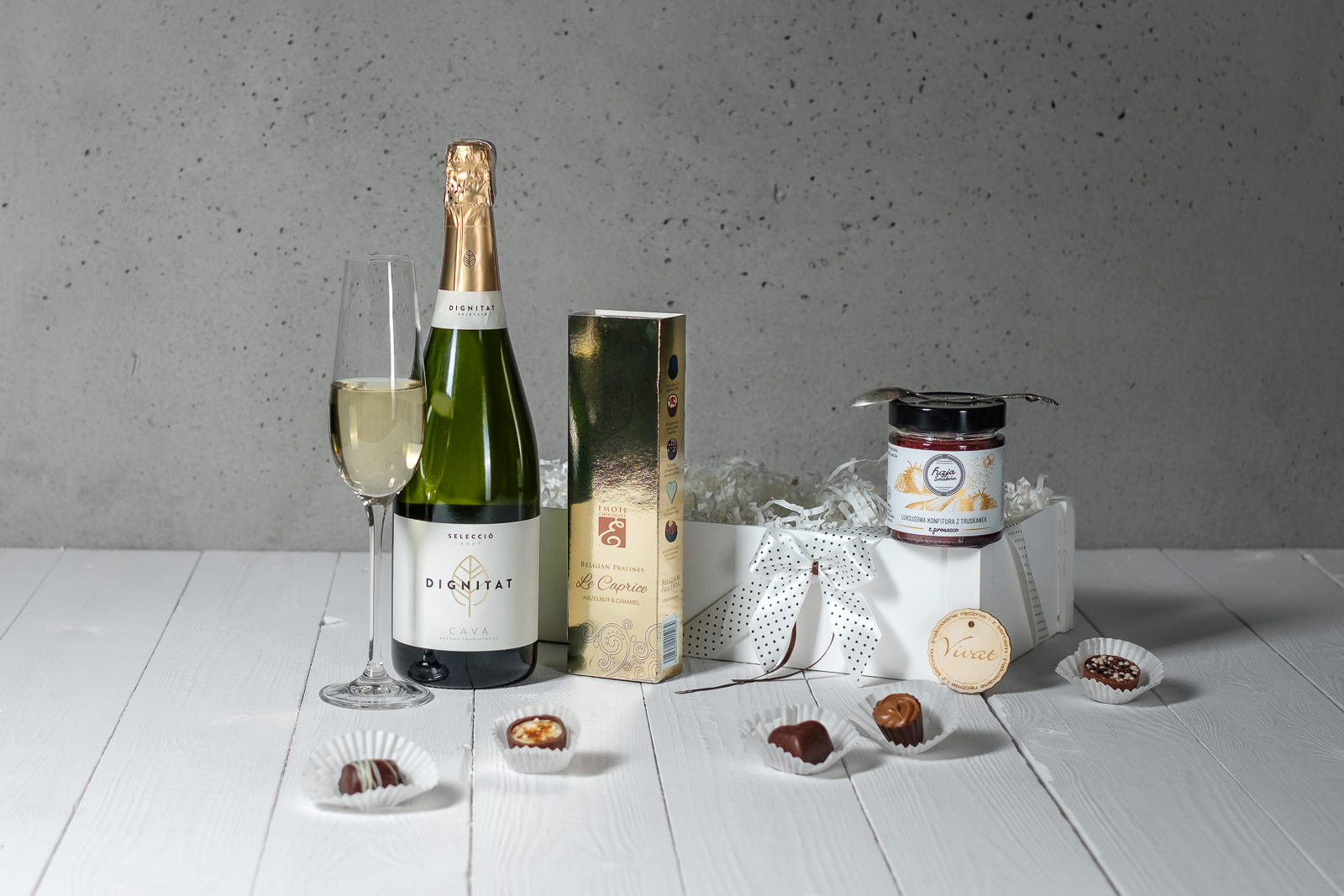 Zestaw prezentowy Trio to doskonała propozycja na prezent zarówno dla kobiet jak i dla mężczyzn, którzy preferują wina musujące. W tym koszu prezentowym poza winem musującym znajdziemy bowiem również luksusową konfiturę z truskawek z prosecco oraz trufle, które doskonale się z nimi komponują. Jest to również idealny pomysł na prezent dla osoby, której chcemy pogratulować sukcesu.