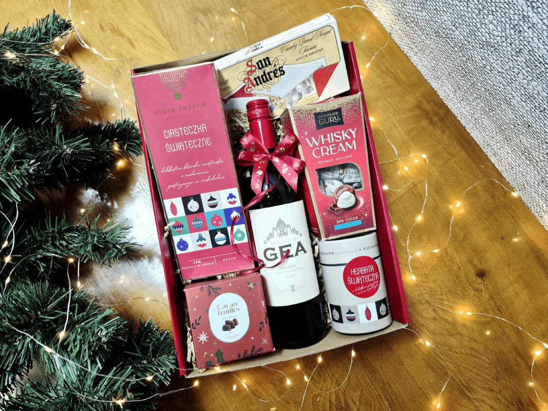 Odkryj wyjątkową kompozycję smaków inspirowaną tradycjami Europy. Ten starannie przygotowany zestaw prezentowy łączy w sobie aromatyczne wino, wykwintne słodycze oraz świąteczne akcenty, tworząc upominek idealny na Boże Narodzenie, Mikołajki czy jako elegancki prezent biznesowy.